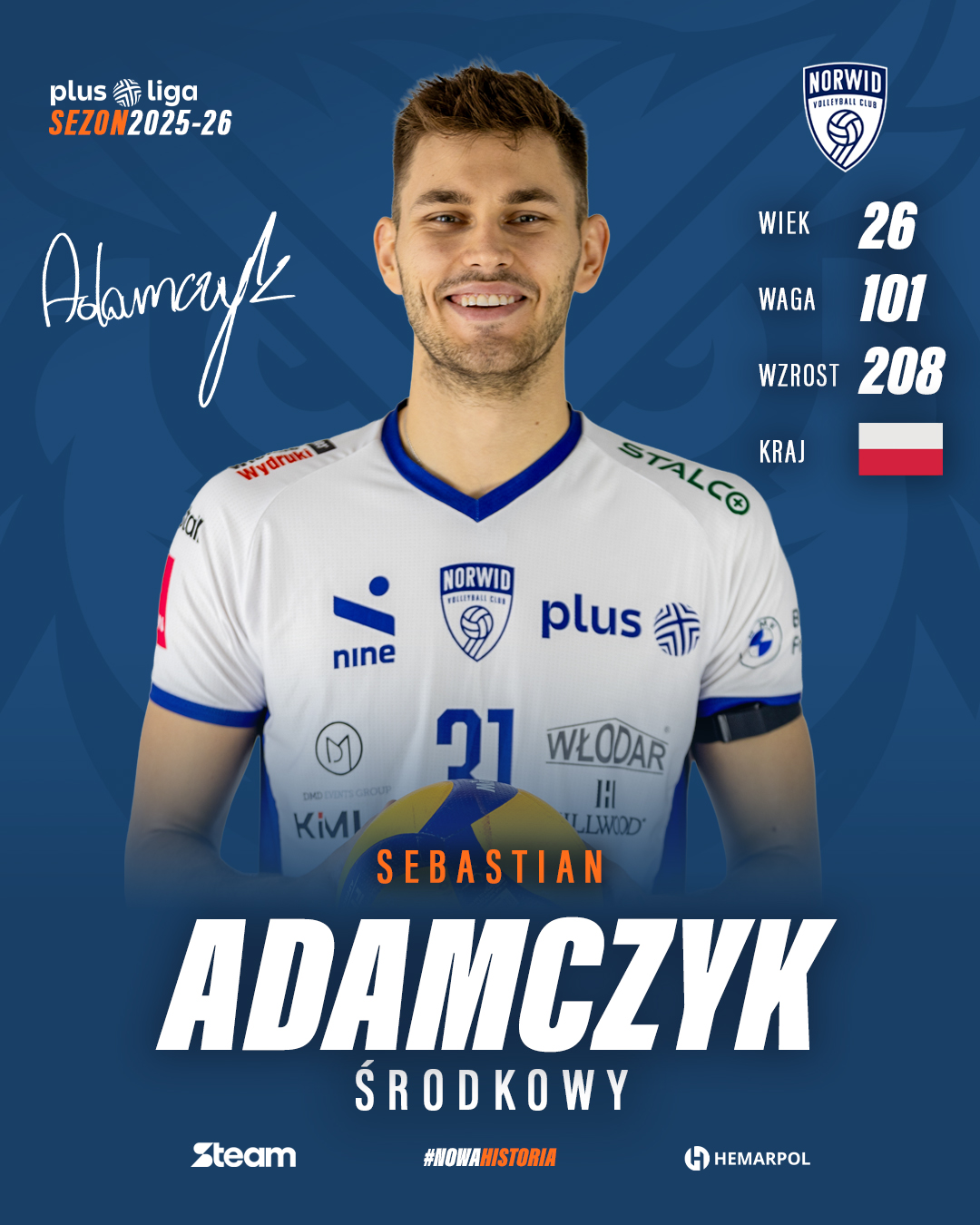 To świetna wiadomość dla wszystkich kibiców Norwida Częstochowa! Sebastian Adamczyk, jeden z kluczowych zawodników naszego zespołu, przedłużył kontrakt i w nadchodzącym sezonie ponownie zobaczymy go na środku siatki w barwach Norwida.